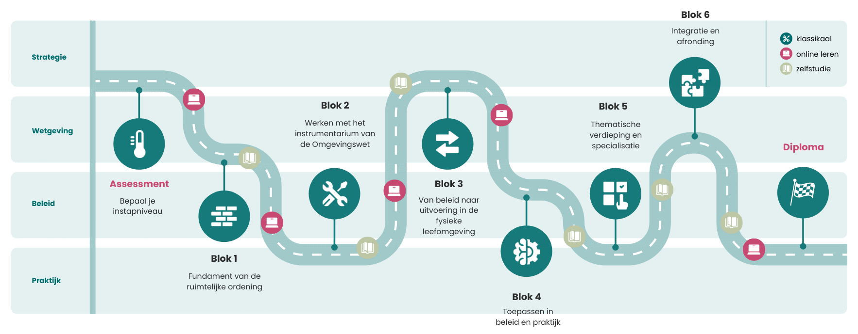 Je ontwikkelt strategisch bewustzijn over ruimtelijke opgaven, legt het juridische en bestuurlijke fundament, en verkent de samenhang met beleidsvorming. Door praktijkervaring en reflectie scherp je je positie in het ruimtelijk domein aan.