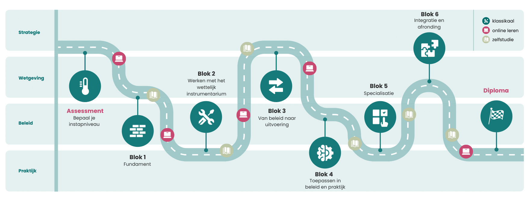 Elke leerlijn bestaat uit vier niveaus: strategie, wettelijk kader, beleid en praktijk. Zo bouw je systematisch kennis en vaardigheden op die passen bij jouw functie en verantwoordelijkheden.