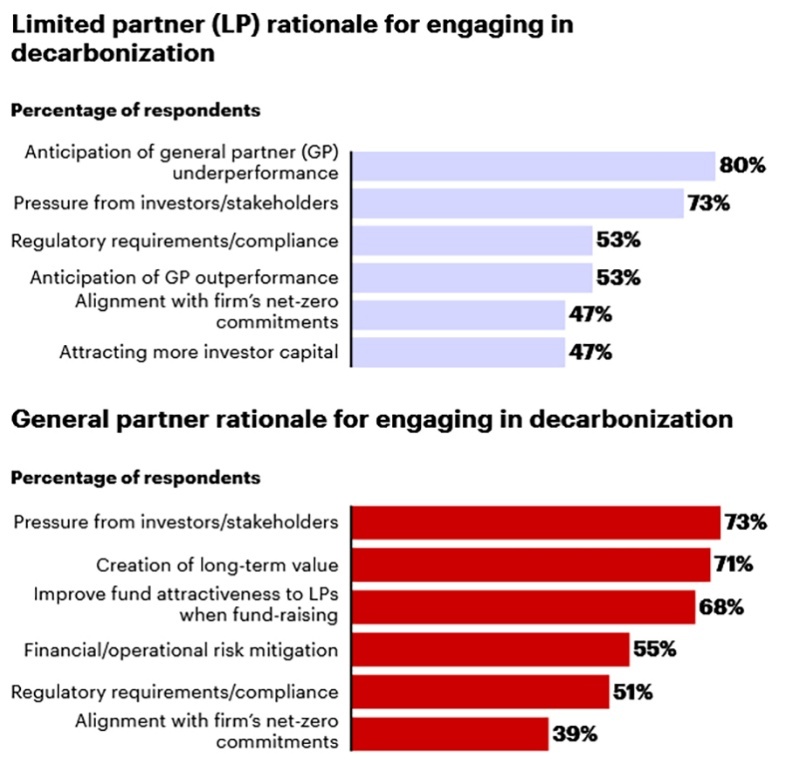 De drijfveer voor deze vergroening is verschoven van idealisme of compliance naar harde economische logica. Uit de enquête onder General Partners (de fondsmanagers) en Limited Partners (de beleggers die het geld inleggen) blijkt dat decarbonisatie een vast onderdeel is geworden van de due diligence.