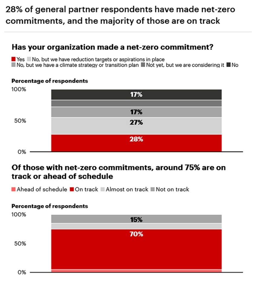 De sector wordt hierin volwassen. Van de fondsmanagers die een harde ‘net-zero’ doelstelling hebben neergelegd (28% van het totaal), ligt driekwart op schema om deze te halen of loopt zelfs voor.