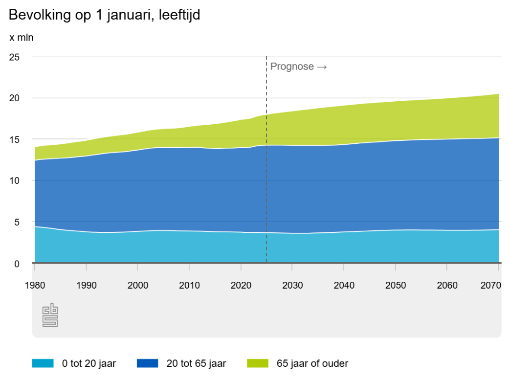 Begin 2025 telde Nederland 3,72 miljoen jongeren en 3,76 miljoen ouderen. Die laatste groep gaat sterker toenemen: in 2070 zijn er naar verwachting 4,1 miljoen jongeren en 5,4 miljoen 65-plussers. Tot aan 2031 neemt het aantal jongeren eerst nog iets af. Bij de ouderen stijgt vooral het aantal 80-plussers: van ruim 0,9 miljoen in 2025 naar 2,1 miljoen in 2070.