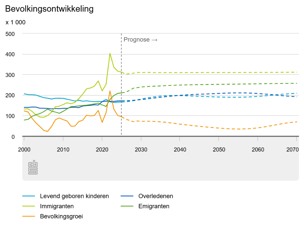 Het aantal overledenen lag vorig jaar, dit jaar en volgend jaar rond de 172 duizend. Er zijn steeds meer ouderen, maar mensen leven ook steeds iets langer. Daardoor blijft het aantal overledenen min of meer hetzelfde. Na 2026 zal het wel weer geleidelijk stijgen. Dit zorgt ervoor dat de bevolking minder snel groeit.